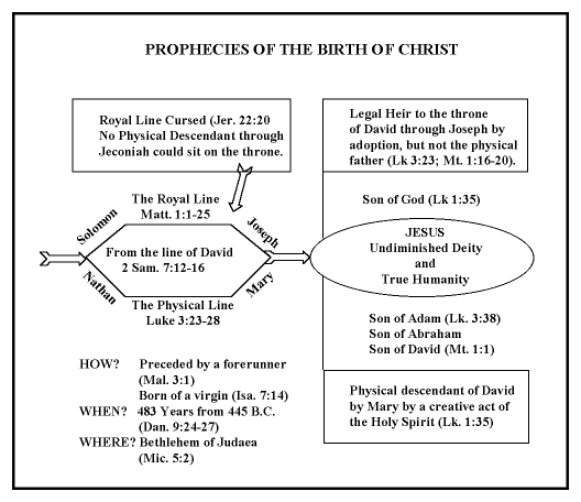 How does the virgin birth accomplish this? Through the virgin birth Jesus became the legal son of Joseph by adoption, but the physical son David through Mary. Joseph, who was in the royal line of David through Solomon, gave Jesus legal title to the throne by adoption (Matthew 1:1-17). Mary, by the Spirit-wrought miracle of the virgin birth, made Jesus a literal son of David through Nathan another one of David's sons (Luke 3:23-38).